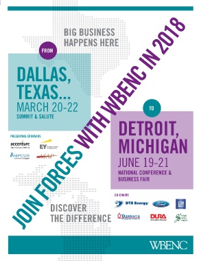 JOIN FORCES WITH WBENC IN 2018 BIG BUSINESS HAPPENS HERE FROM DALLAS, TEXAS... MARCH 20-22 TO SUMMIT & SALUTE DETROIT, PRESENTING SPONSORS MICHIGAN JUNE 19-21 NATIONAL CONFERENCE & BUSINESS FAIR CO-CHAIRS DISCOVER THE DIFFERENCE